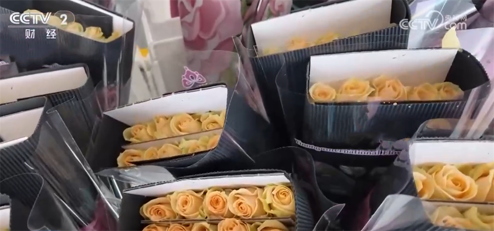 商家介紹,本月出口鮮花的發(fā)貨量是日常的五倍,目前訂單已經(jīng)排到年后。新鮮采摘的鮮花在出口商車間完成分揀、包裝、保鮮等處理后,由冷鏈送往機(jī)場過關(guān)出口,整個流程最快不到20小時就能完成。