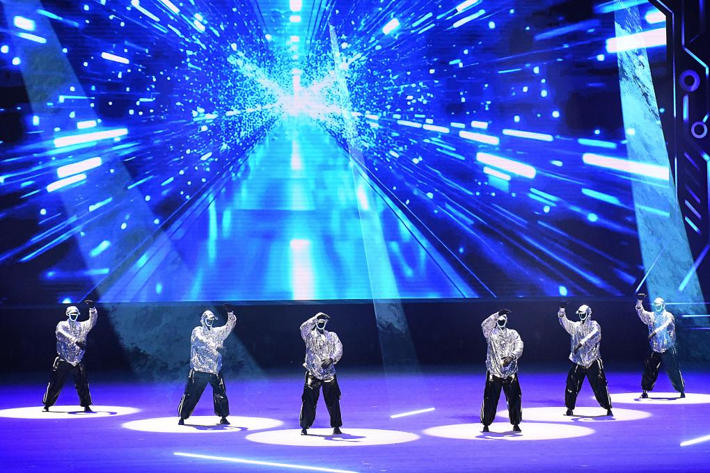 在開場節(jié)目《萬馬奔騰》中,20臺機械臂與26臺雙臂機器人齊揮鼓槌,激昂鼓聲奏出奮進節(jié)拍。