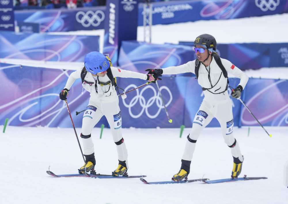 獲得米蘭-科爾蒂納冬奧會(huì)滑雪登山混合接力比賽第八名的中國(guó)組合次旦玉珍(左)/布魯爾在終點(diǎn)處合影(2026年2月21日攝)。新華社記者 胡虎虎 攝