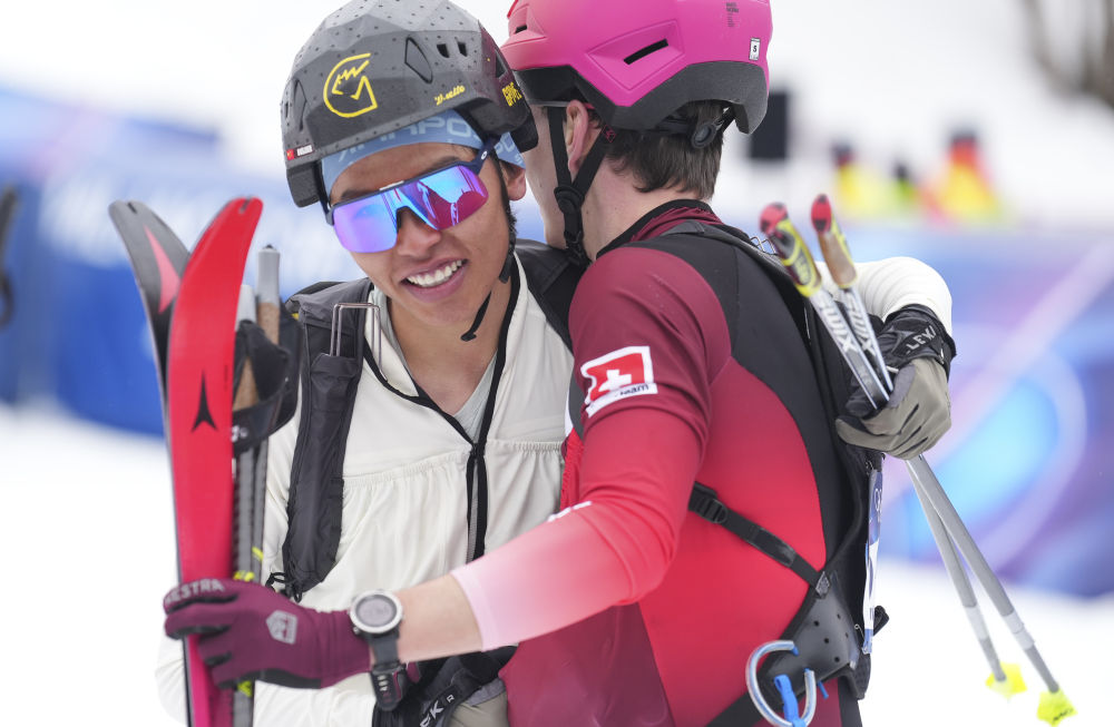 米蘭-科爾蒂納冬奧會(huì)滑雪登山混合接力比賽后,布魯爾(左)與瑞士選手相擁致意(2026年2月21日攝)。新華社記者 胡虎虎 攝
