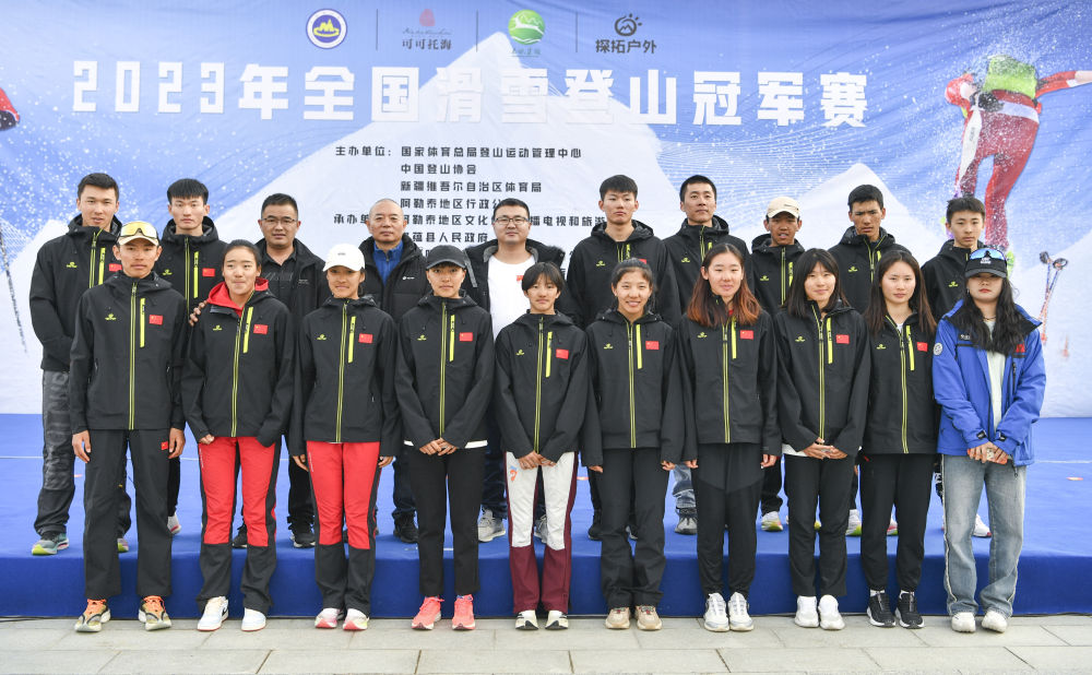 這是在首屆全國(guó)滑雪登山冠軍賽期間拍攝的布魯爾(前排左一)、次旦玉珍(前排左五)和國(guó)家集訓(xùn)隊(duì)合影(2023年4月7日攝)。新華社記者 胡虎虎 攝