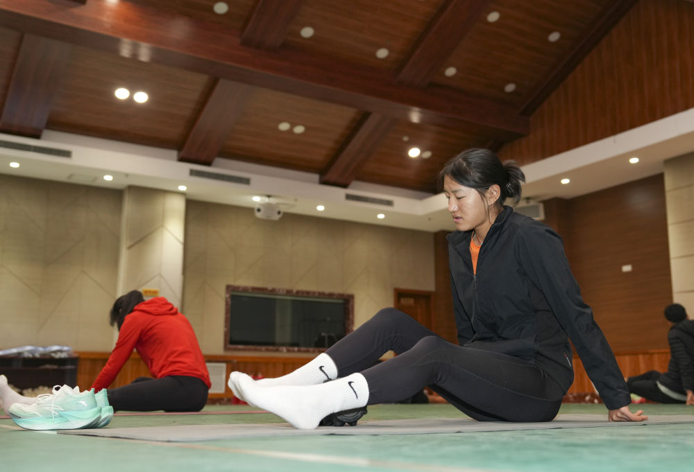 冬奧會(huì)前,次旦玉珍在一次訓(xùn)練后拉伸放松(2025年12月15日攝)。新華社記者 胡虎虎 攝