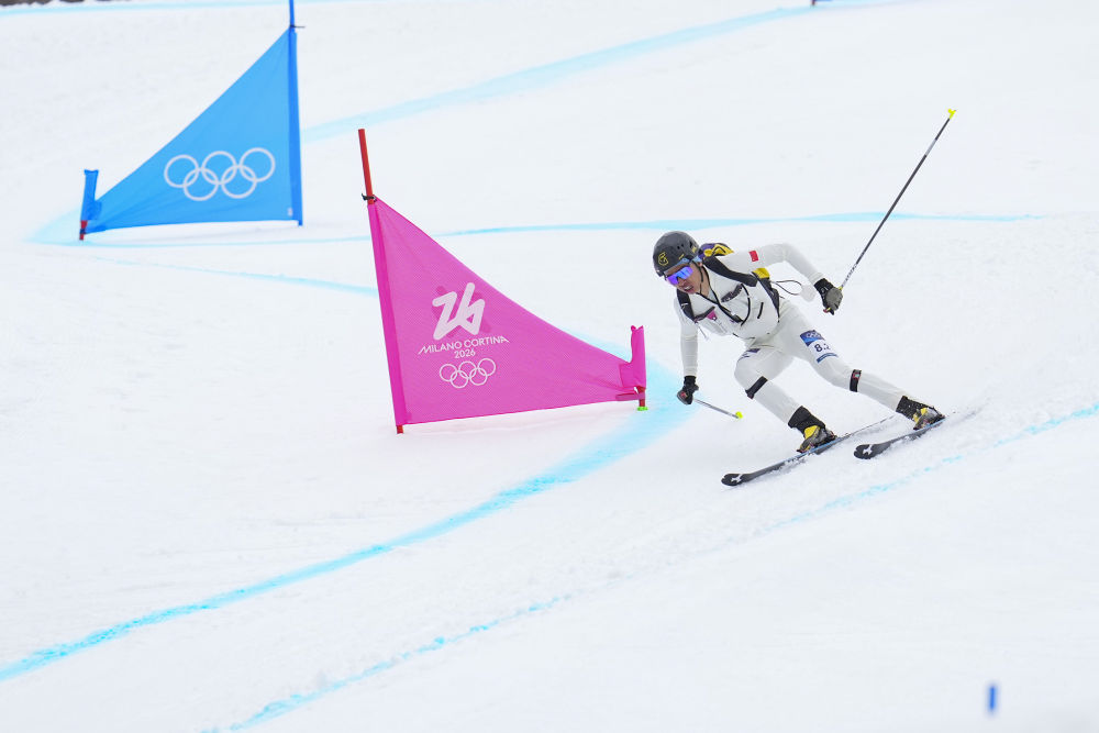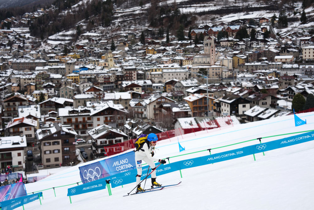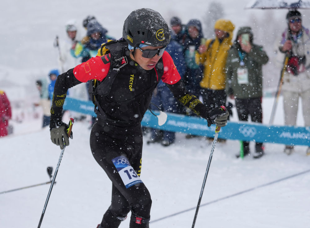 2026年2月21日,次旦玉珍在米蘭-科爾蒂納冬奧會(huì)滑雪登山混合接力比賽中。新華社記者 胡虎虎 攝