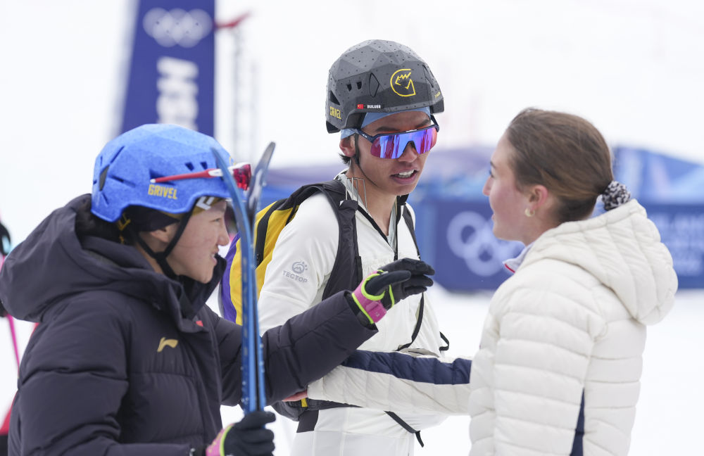 米蘭-科爾蒂納冬奧會(huì)滑雪登山混合接力比賽后,次旦玉珍(左)、布魯爾(中)與其他參賽選手交流(2026年2月21日攝)。新華社記者 胡虎虎 攝