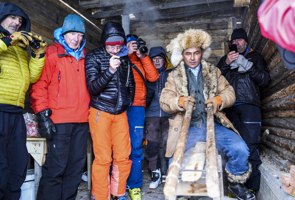在新疆阿勒泰地區(qū)禾木村,來(lái)自歐洲的雪友觀看牧民制作古老毛皮滑雪板(2019年1月10日攝)。新華社記者 胡虎虎 攝