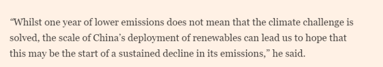 同時,文章稱南安普頓大學(xué)的一位氣候科學(xué)家表示,這些數(shù)據(jù)令人鼓舞,因為它們表明中國對綠色能源的大規(guī)模投資開始轉(zhuǎn)化為可衡量的成果?!半m然一年的減排并不意味著氣候挑戰(zhàn)已經(jīng)解決,但中國在可再生能源方面的大規(guī)模發(fā)展讓我們有理由期待,這或許將是其排放量持續(xù)下降的開端?!?/p>