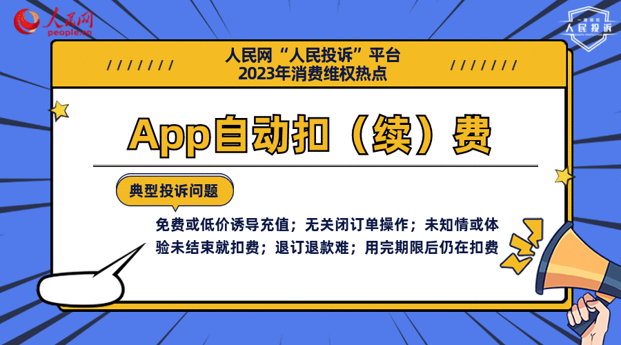 2023年以來,“人民投訴”上,被投訴的App類別涉及工具類、休閑娛樂類、閱讀學(xué)習(xí)類、通信平臺類、生活服務(wù)類、游戲類、出行服務(wù)類等多個領(lǐng)域。“未收到提示,被直接扣除一年超級會員費(fèi)”“購買了一年圖片使用權(quán),無按鈕或通道取消自動扣費(fèi)服務(wù)”“點(diǎn)擊免費(fèi)試用卻被惡意扣費(fèi),平臺不退費(fèi)”“7天體驗期未到,提前12小時自動扣費(fèi)”“購買1年會員并充值成功,商家以充值成功為由擅自開通自動扣費(fèi)季度會員”“以1元試用默認(rèn)開通自動續(xù)費(fèi)服務(wù),扣費(fèi)達(dá)20月”“購買包月會員時,沒有別的選項可以選擇,都帶著自動續(xù)費(fèi)”“免費(fèi)七天VIP,在第六天就被取消了”“已經(jīng)卸載幾個月了,還在扣錢”等侵權(quán)行為令網(wǎng)友困擾不已。
