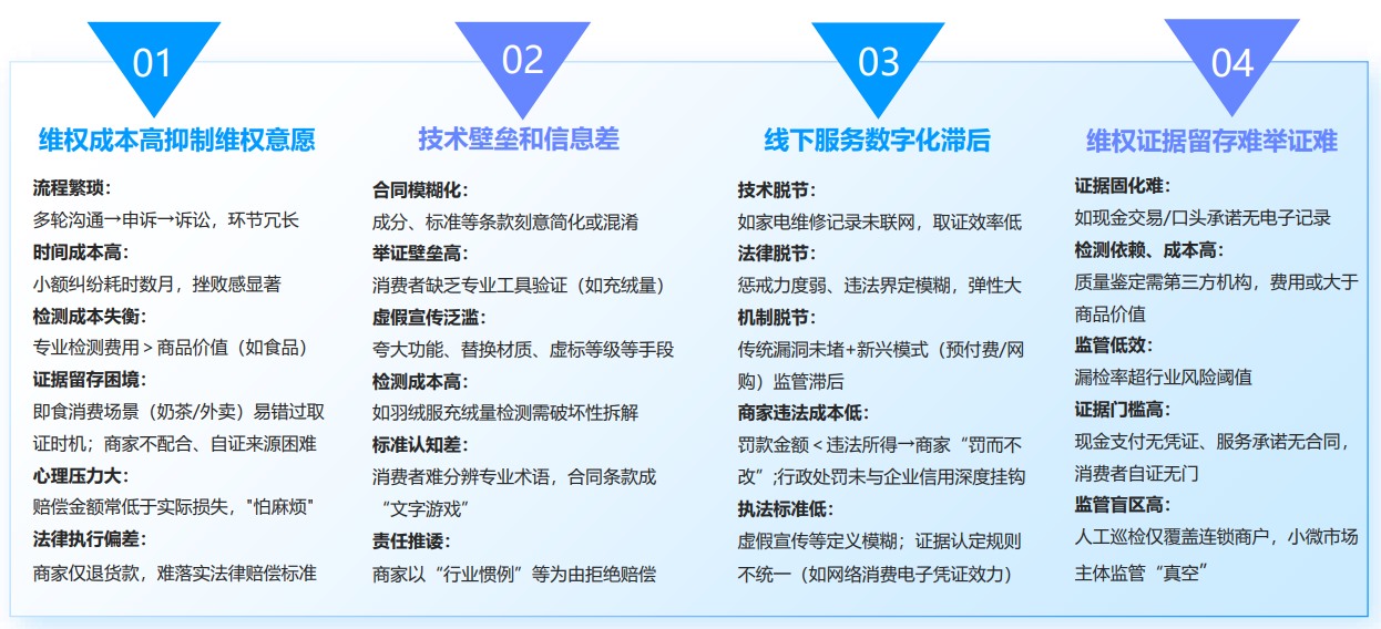 通過對消費維權(quán)新老問題的梳理和分析,“人民投訴”認為,傳統(tǒng)問題多因信息不對稱和監(jiān)管漏洞,而新難題則疊加了技術(shù)復(fù)雜性(如算法操控)和新業(yè)態(tài)模式(如直播、盲盒),維權(quán)難度升級。