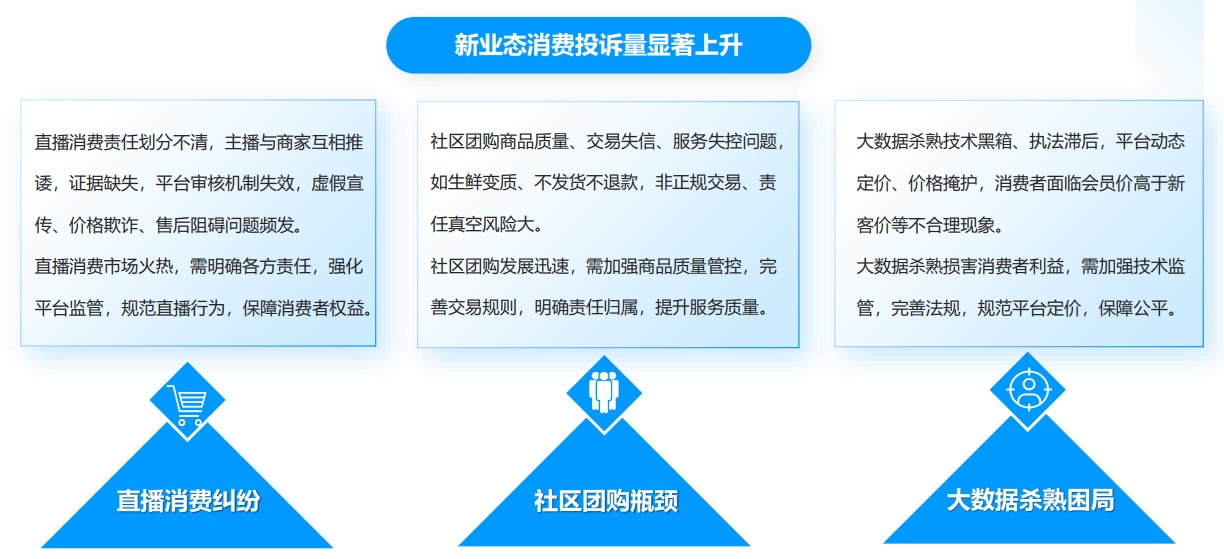 另一方面是新領(lǐng)域“新痛點”愈加顯現(xiàn)。“人民投訴”觀察到,過去一年,直播電商、社區(qū)團購、大數(shù)據(jù)殺熟等新模式新業(yè)態(tài)中的消費投訴顯著上升。