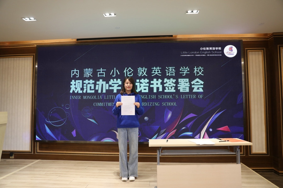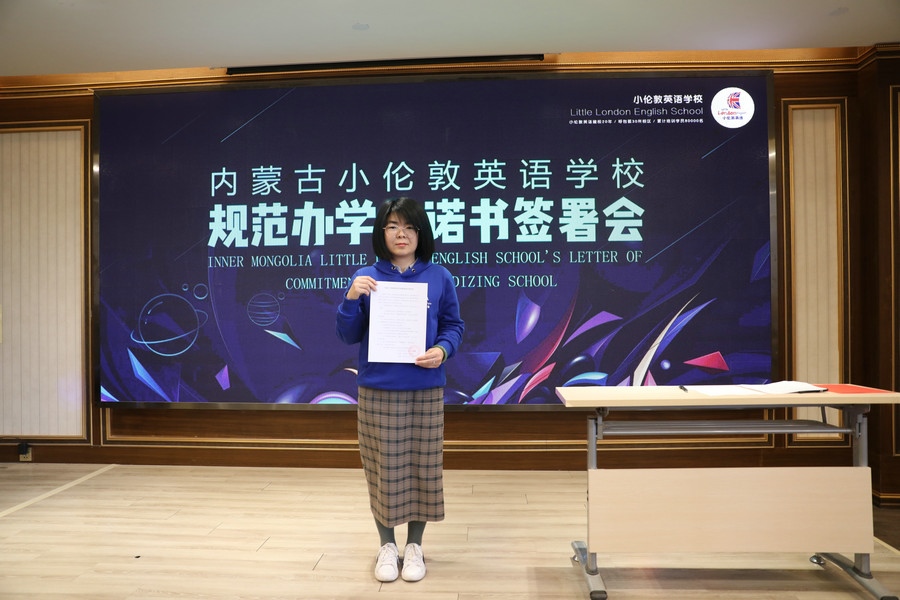 “堅持黨的領(lǐng)導(dǎo),堅持社會主義辦學(xué)方向,持證辦學(xué),依法辦學(xué)。以興趣培養(yǎng)為目標(biāo),推動國際化人才的培養(yǎng)。堅決推進“減負”,不擅自提升學(xué)費,不在法定節(jié)假日安排授課。招生宣傳真實可信,杜絕夸大宣傳、虛假承諾、捆綁誘導(dǎo)、隱瞞欺詐等方式誤導(dǎo)學(xué)生及家長的行為……”簽署會現(xiàn)場,內(nèi)蒙古小倫敦英語學(xué)校副校長尚燕云宣讀《內(nèi)蒙古小倫敦英語學(xué)校規(guī)范辦學(xué)承諾書》。