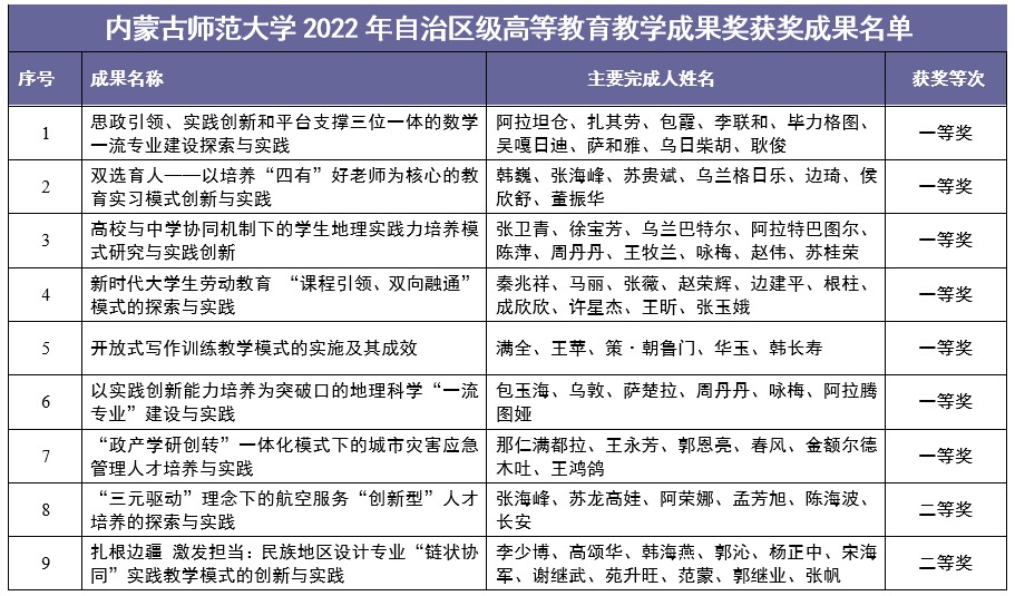 北疆新聞網(wǎng)、北疆新聞APP、北疆云消息(記者 李艷紅)近日,內(nèi)蒙古自治區(qū)教育廳發(fā)布了《關(guān)于公布2022年自治區(qū)級高等教育教學(xué)成果獎(jiǎng)獲獎(jiǎng)成果的通知》,內(nèi)蒙古師范大學(xué)微官網(wǎng)由數(shù)學(xué)科學(xué)學(xué)院牽頭、黨委書記阿拉坦倉主持的《思政引領(lǐng)、實(shí)踐創(chuàng)新和平臺支撐三位一體的數(shù)學(xué)一流專業(yè)建設(shè)與實(shí)踐》等17個(gè)推薦至自治區(qū)的教學(xué)成果均獲獎(jiǎng),實(shí)現(xiàn)了100%的獲獎(jiǎng)率。其中,一等獎(jiǎng)7項(xiàng),二等獎(jiǎng)4項(xiàng),三等獎(jiǎng)6項(xiàng)。一等獎(jiǎng)獲獎(jiǎng)數(shù)量及總獲獎(jiǎng)率位居全區(qū)之首。