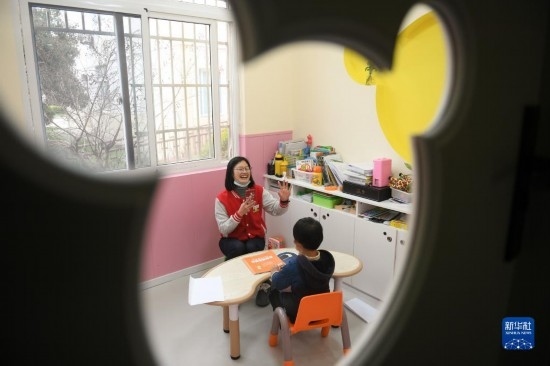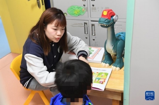 3月29日,一名老師在給自閉癥兒童做一對一訓練。