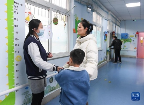 3月29日,一名家長(左三)在課后向老師了解孩子的狀況。