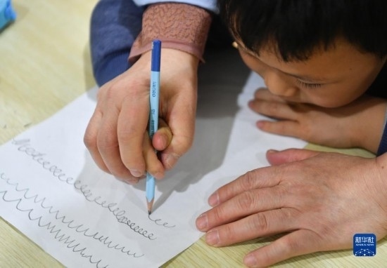 3月30日,在西安市金色陽光康復中心,特教老師指導孩子進行繪畫練習。