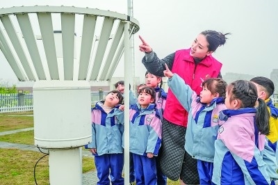 浙江長興國家氣象觀測站,科普志愿者向龍山街道中心幼兒園的孩子介紹氣象知識。新華社發(fā)