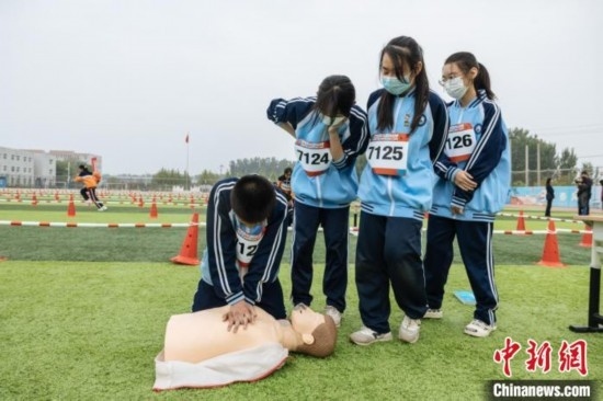 在“紅氣球校園挑戰(zhàn)賽”上,學(xué)生參與完成骨折固定、海姆立克急救法、心肺復(fù)蘇等技能操作 中國紅基會(huì) 供圖