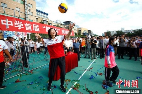 圖為郎平為陳經(jīng)綸中學(xué)首屆“郎平杯”排球聯(lián)賽開(kāi)球。中新社記者 富田 攝