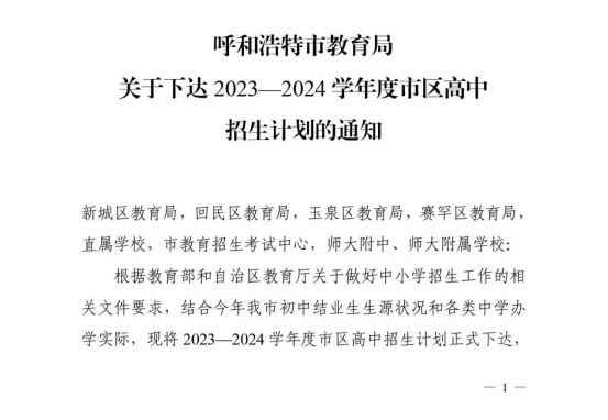 13日,呼和浩特市教育局發(fā)布2023-2024學(xué)年度市區(qū)高中招生計劃的通知,同時明確有關(guān)要求。