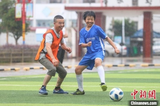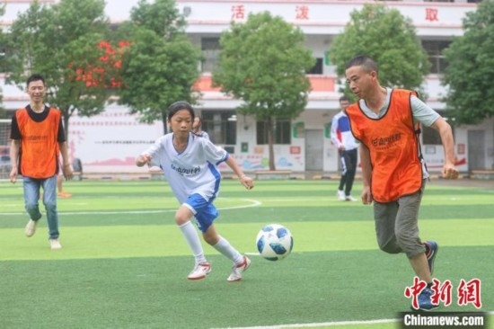 “今天第一次和爸爸踢球,我特別高興和感動。他踢得很好,還帶球過了我?guī)状巍N蚁M职忠院竽芏嗯阄姨咔??!?4日,在江西贛州尋烏縣澄江中心校的足球場上,來自該校晨曦女子足球隊的隊員廖怡菱和其他四位隊員在父親節(jié)前夕,驚喜地見到了自己身在外地工作的父親,并第一次和父親一起踢球,進行了一場特別的親子足球賽。