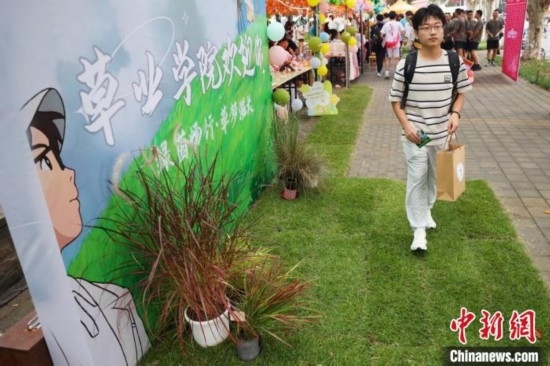 新生從展示的草皮上走過,該草種為南京農(nóng)業(yè)大學(xué)草坪科學(xué)與管理團(tuán)隊(duì)自主培育的藍(lán)光中華結(jié)縷草,葉寬中等,葉色藍(lán)綠,觀賞度高,且耐踐踏,抗旱性強(qiáng),抗病蟲能力強(qiáng)。泱波 攝