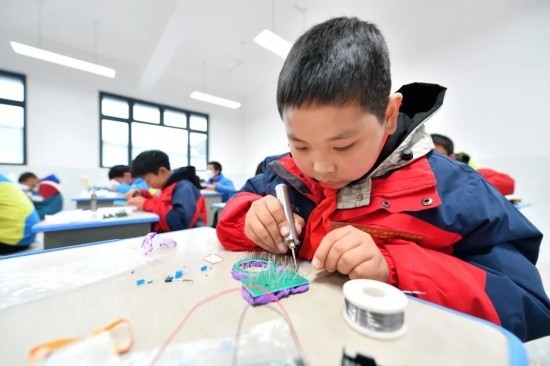 2023年12月14日,在湖北省襄陽(yáng)市??悼h后坪鎮(zhèn)中心學(xué)校,學(xué)生們參加電子制作競(jìng)賽。通訊員 楊韜 黃玲 攝