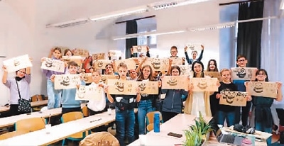 匈牙利羅蘭大學(xué)孔子學(xué)院下設(shè)埃格爾教學(xué)點(diǎn)多博·伊什特萬(wàn)中學(xué)中文課堂的學(xué)生們展示繪畫作品。