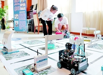 上海電子信息職業(yè)技術(shù)學院的師生展示智能機器人創(chuàng)新開發(fā)項目。 新華社發(fā)