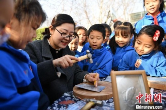 3月11日,河北省級非物質(zhì)文化遺產(chǎn)項目“郭氏鐵板浮雕”傳承人郭墨涵(黑衣)為學(xué)生展示技藝。中新網(wǎng)記者 翟羽佳 攝