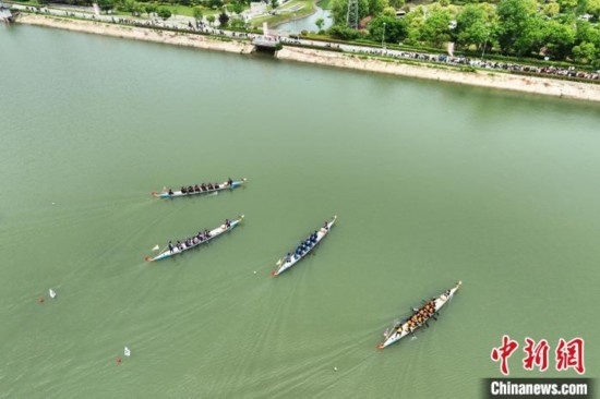 5月2日,來自長三角地區(qū)的12所高校的龍舟隊齊聚安徽肥西,展開了一場龍舟競技。(無人機照片)陳家樂攝