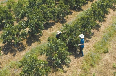 | 曹立新(右)在柑橘基地里給農(nóng)民做技術(shù)指導(dǎo)。鄭家裕攝 |
