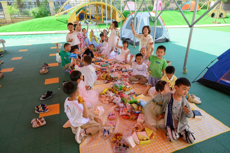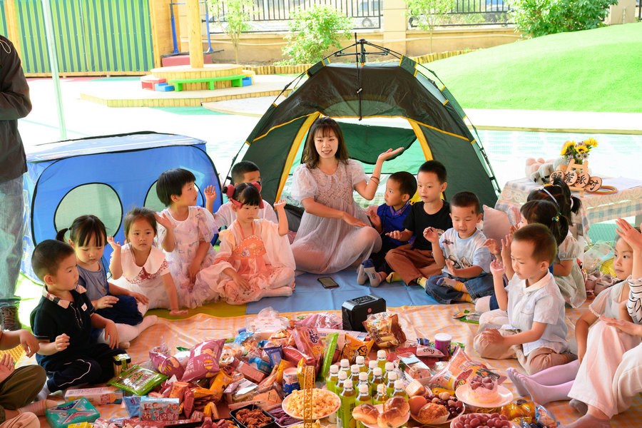 當(dāng)日,在幼兒園的操場(chǎng)上,五顏六色的野餐墊鋪,可愛俏皮的帳篷,精致的裝飾,數(shù)不勝數(shù)的水果點(diǎn)心,小朋友們?cè)陉帥鎏幈M情享受著美味,與老師們一起享受著夏日里野餐派對(duì)的美好。