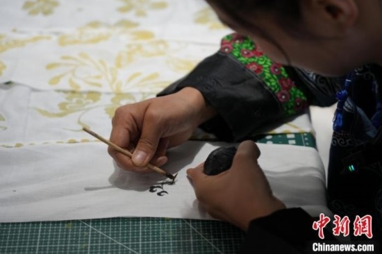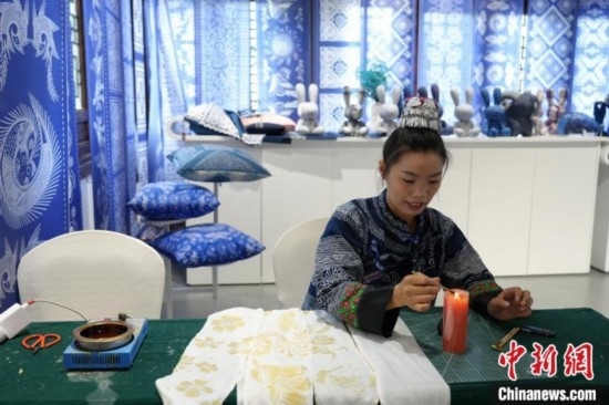 貴州織金苗族蠟染2021年6月入選國(guó)務(wù)院公布第五批國(guó)家級(jí)非物質(zhì)文化遺產(chǎn)代表性項(xiàng)目名錄?!?5后”苗族女孩王秋雨大學(xué)畢業(yè)后回到織金,成為一名織金苗族蠟染推廣者。她不僅使用傳統(tǒng)小臘刀,還使用大臘刀和毛筆,以蜂蠟為墨在絲巾、衣服、箱包上繪制小篆、甲骨文、山水等文字與圖案,這些蠟染產(chǎn)品深受消費(fèi)者喜愛(ài)。圖為6月19日,王秋雨在織金縣平遠(yuǎn)古鎮(zhèn)的依文織金數(shù)字化展廳制作蠟染。周燕玲 攝