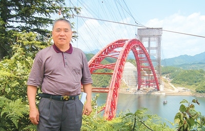 由鄭皆連指導(dǎo)建造的安徽黃山太平湖大橋跨徑達(dá)330米。圖為鄭皆連在施工現(xiàn)場(chǎng)。