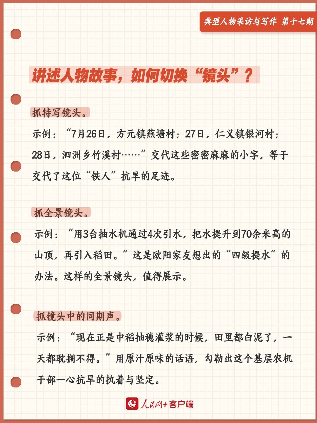 歐陽家友家中的日歷,其實就是他的抗旱工作表?!?月26日,方元鎮(zhèn)燕塘村;27日,仁義鎮(zhèn)銀河村;28日,泗洲鄉(xiāng)竹溪村……”交代這些密密麻麻的小字,等于交代了這位“鐵人”抗旱的足跡。這樣的特寫鏡頭,不應錯過。