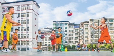 湖南省永州市道縣樹湘學(xué)?;@球訓(xùn)練營,孩子們在參加籃球訓(xùn)練。蔣克青攝(新華社發(fā))