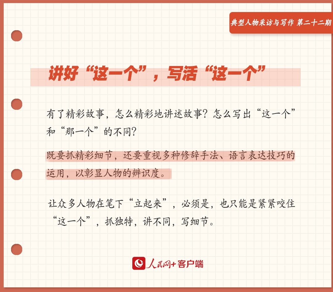 把好故事講精彩,讓“這一個(gè)”立起來,既要抓精彩細(xì)節(jié),還要重視多種修辭手法、語言表達(dá)技巧的運(yùn)用,以彰顯人物的辨識度。