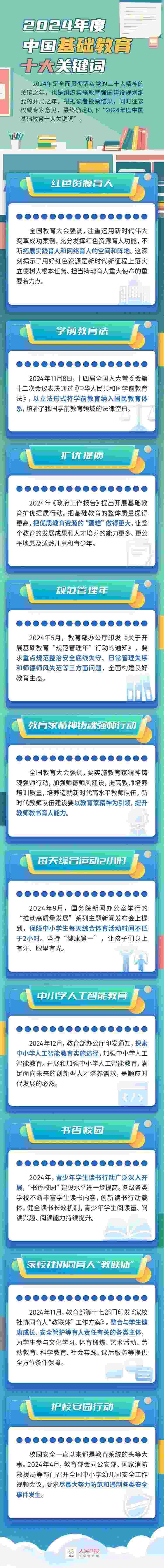教育興則國(guó)家興,教育強(qiáng)則國(guó)家強(qiáng)。建設(shè)教育強(qiáng)國(guó),基點(diǎn)在基礎(chǔ)教育。2024年是組織實(shí)施教育強(qiáng)國(guó)建設(shè)規(guī)劃綱要的開(kāi)局之年。這一年來(lái),中國(guó)基礎(chǔ)教育領(lǐng)域在深化綜合改革、加快推進(jìn)高質(zhì)量發(fā)展的道路上奮勇向前,不斷增強(qiáng)人民群眾的教育獲得感、幸福感、安全感,繼續(xù)答好“強(qiáng)國(guó)建設(shè)、教育何為”的時(shí)代課題。在教育部基礎(chǔ)教育司指導(dǎo)下,人民日?qǐng)?bào)少年客戶端推出《揭曉!2024年中國(guó)基礎(chǔ)教育十大關(guān)鍵詞》圖解,讓我們一起關(guān)注。