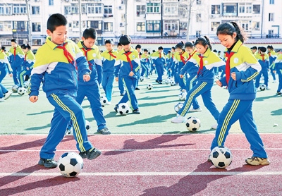 新學期伊始,河北省秦皇島市海港區(qū)耀華小學以足球素質(zhì)操等活動結(jié)合十余種自主游戲項目,讓學生在趣味活動中提升體能。圖為2月18日,學生在展示足球素質(zhì)操。