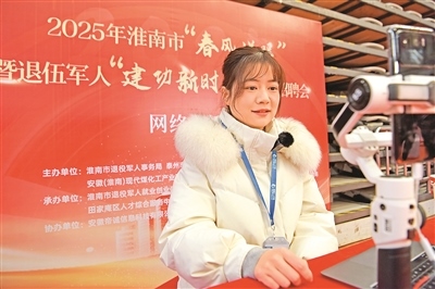 近日,安徽省淮南市舉行2025年“春風(fēng)送暖”大型招聘會,351家企業(yè)提供近萬個工作崗位。圖為一名主播在招聘會現(xiàn)場進行網(wǎng)絡(luò)直播助力就業(yè)。