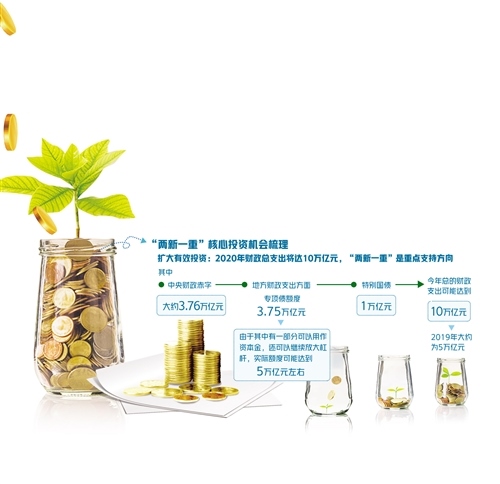 為重點(diǎn)支持既促消費(fèi)惠民生又調(diào)結(jié)構(gòu)增后勁的“兩新一重”建設(shè),根據(jù)《政府工作報(bào)告》,今年特別安排地方政府專項(xiàng)債券3.75萬億元,比2019年有所增加;另有抗疫特別國(guó)債1萬億元,資金用途共涉及6個(gè)領(lǐng)域,其中有部分也指向“兩新一重”建設(shè)領(lǐng)域。