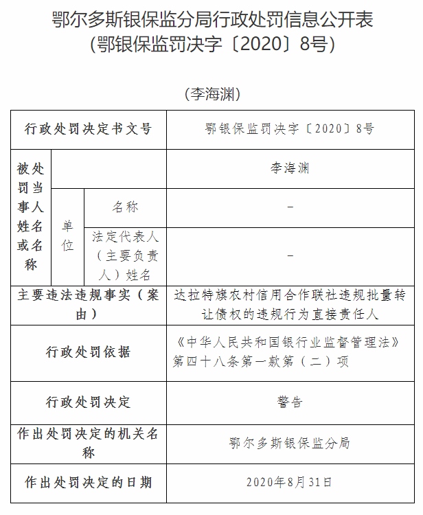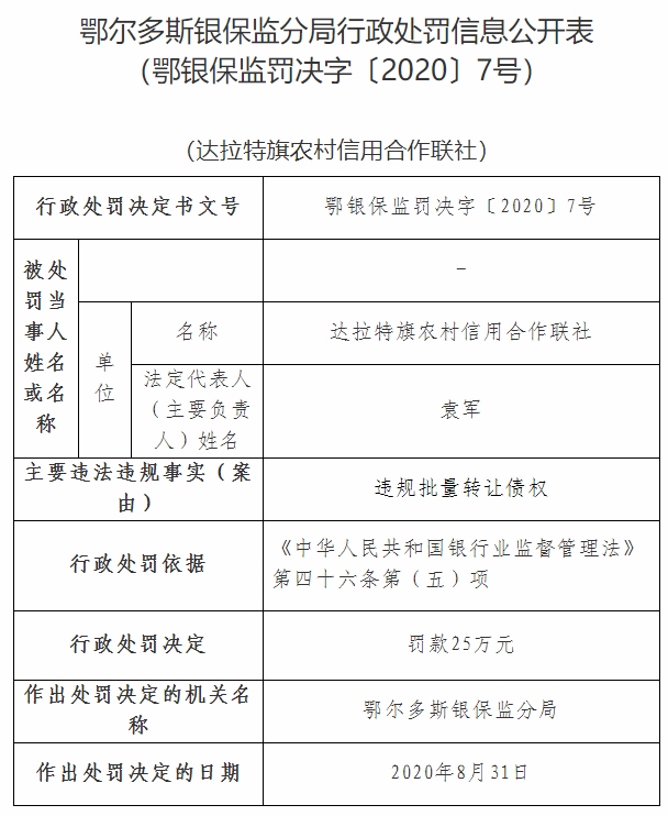 北疆新聞網(wǎng)、北疆新聞客戶端消息(記者 張楊)11月5日,銀保監(jiān)會官網(wǎng)通報達(dá)拉特旗農(nóng)村信用合作聯(lián)社違規(guī)批量轉(zhuǎn)讓債權(quán),被鄂爾多斯銀保監(jiān)分局依據(jù)《中華人民共和國銀行業(yè)監(jiān)督管理法》第四十六條第(五)項,處以罰款25萬元。其法定代表人李海淵作為達(dá)拉特旗農(nóng)村信用合作聯(lián)社違規(guī)批量轉(zhuǎn)讓債權(quán)的違規(guī)行為直接責(zé)任人,被鄂爾多斯銀保監(jiān)分局依據(jù)《中華人民共和國銀行業(yè)監(jiān)督管理法》第四十八條第一款第(二)項,處以警告處罰。