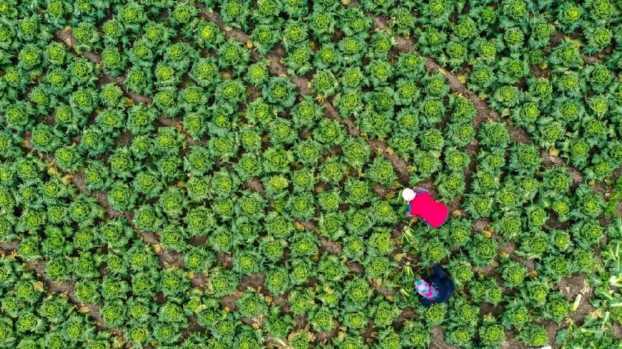 2021年11月4日,河北省唐山市豐南區(qū)王蘭莊鎮(zhèn)高先甸村的菜農(nóng)在蔬菜基地收獲大白菜(無人機(jī)照片)。新華社發(fā)(劉滿倉攝)