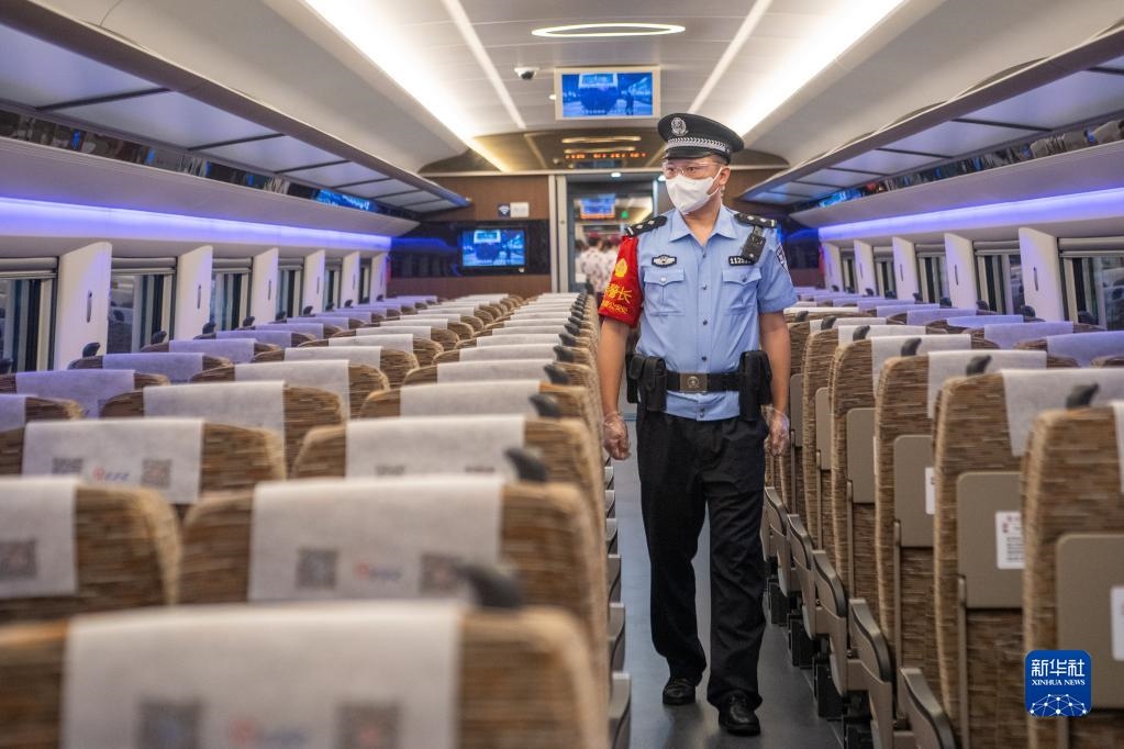 6月19日,鐵路公安在首發(fā)列車CR400AF復(fù)興號動車組上進(jìn)行巡檢作業(yè)。新華社記者 唐奕 攝