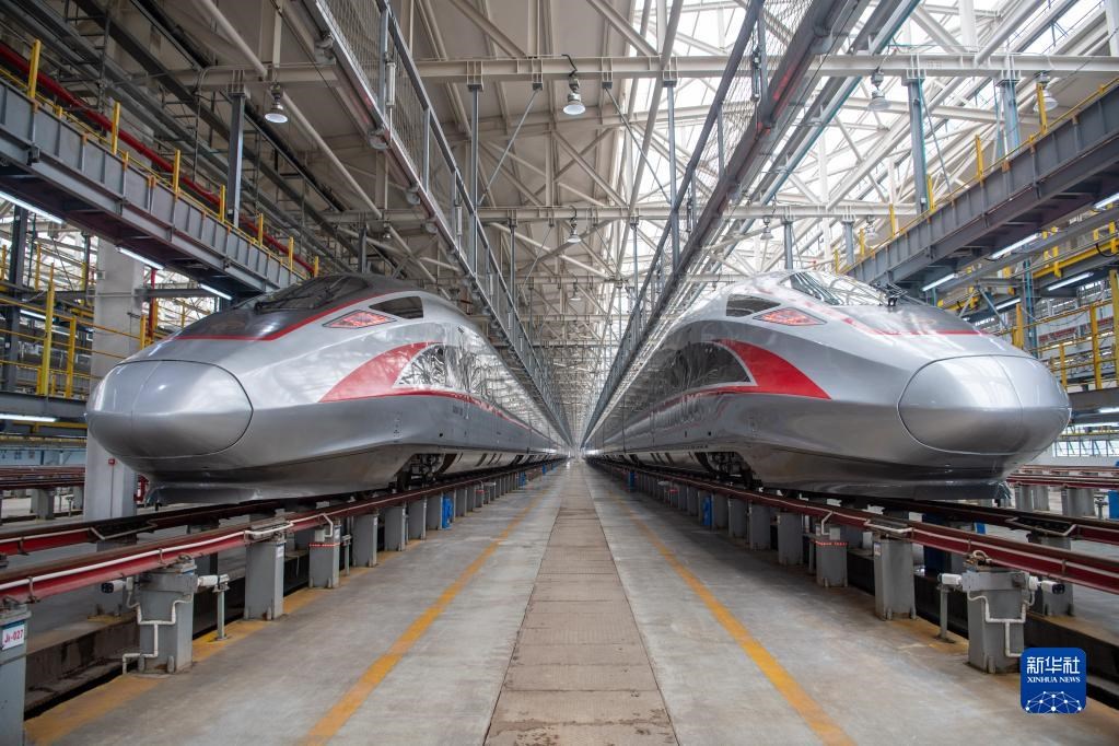 6月19日,鄭渝高鐵全線開通運(yùn)營重慶首發(fā)列車CR400AF復(fù)興號動車組(左)在重慶車輛段西動車所亮相。新華社記者 唐奕 攝