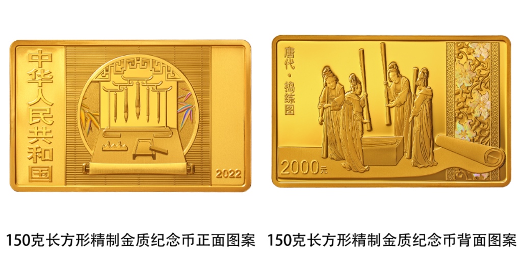 該套金銀紀(jì)念幣正面圖案均為筆、墨、紙、硯造型,輔以竹葉、窗等裝飾組合設(shè)計(jì),背面圖案則各有特色。一枚150克長方形金質(zhì)紀(jì)念幣背面圖案為《搗練圖》中搗練場景,襯以裝飾紋樣組合設(shè)計(jì),并刊“唐代·搗練圖”字樣及面額。