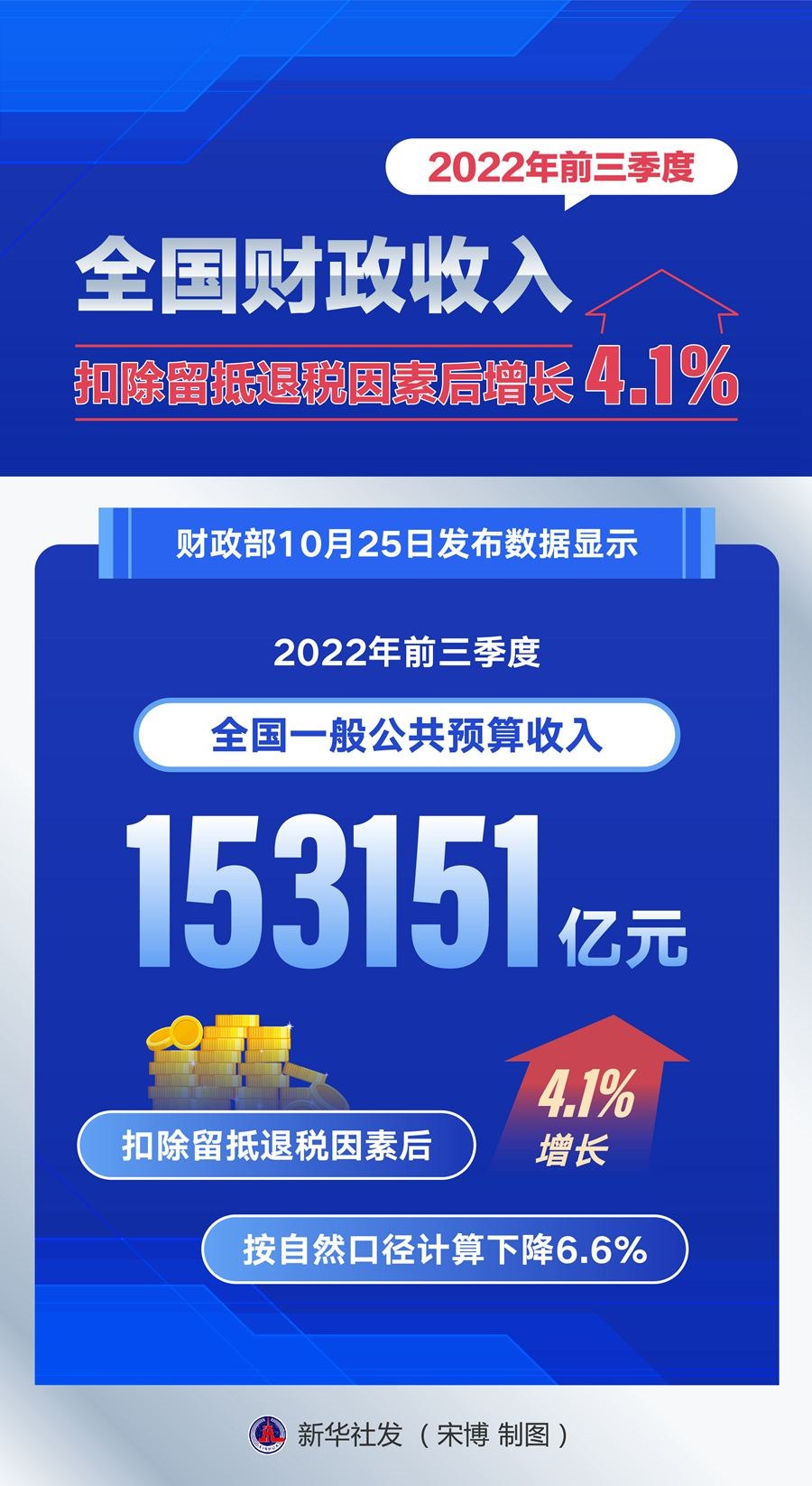 財政部25日發(fā)布數(shù)據顯示,今年前三季度,全國一般公共預算收入153151億元,扣除留抵退稅因素后增長4.1%,按自然口徑計算下降6.6%。
