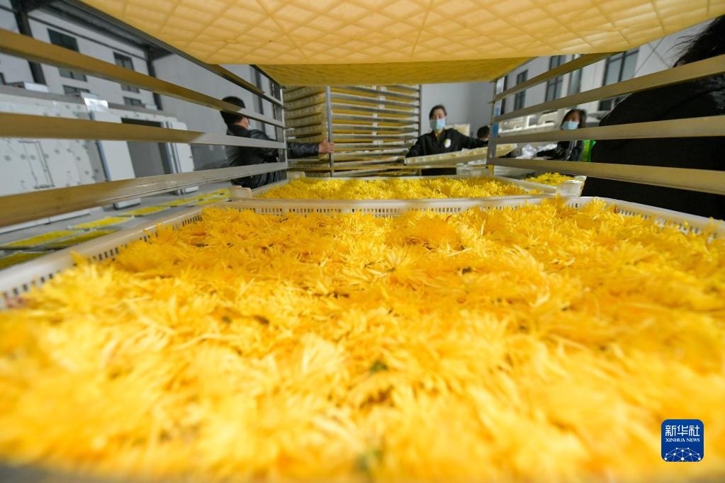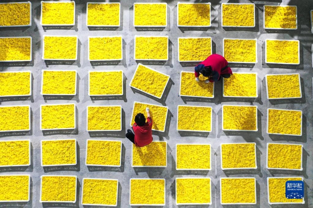 金秋時節(jié),貴州省黔南布依族苗族自治州貴定縣云霧鎮(zhèn)種植的1000余畝菊花陸續(xù)進入采摘期,當?shù)卮迕衩χ烧⒎謷?、烘干菊花,供應市場?/p>