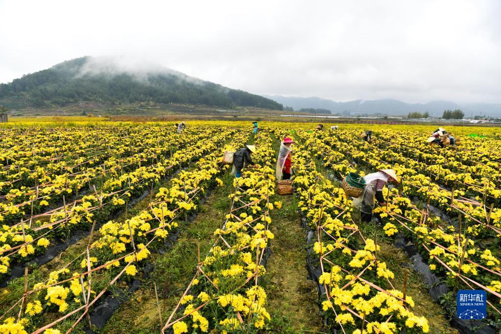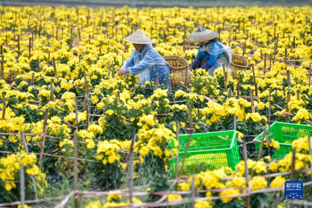 10月21日,村民在貴州省貴定縣云霧鎮(zhèn)菊花種植基地采摘金絲皇菊。新華社記者 楊文斌 攝