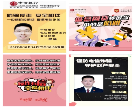 疫情期間,中信銀行呼和浩特分行各經(jīng)營(yíng)機(jī)構(gòu)積極開(kāi)展線上反詐宣傳,通過(guò)朋友圈、公眾號(hào)及線上直播活動(dòng)積極開(kāi)展金融反詐宣傳,切實(shí)提升金融客戶識(shí)別詐騙手段的能力和防范金融風(fēng)險(xiǎn)的意識(shí)。