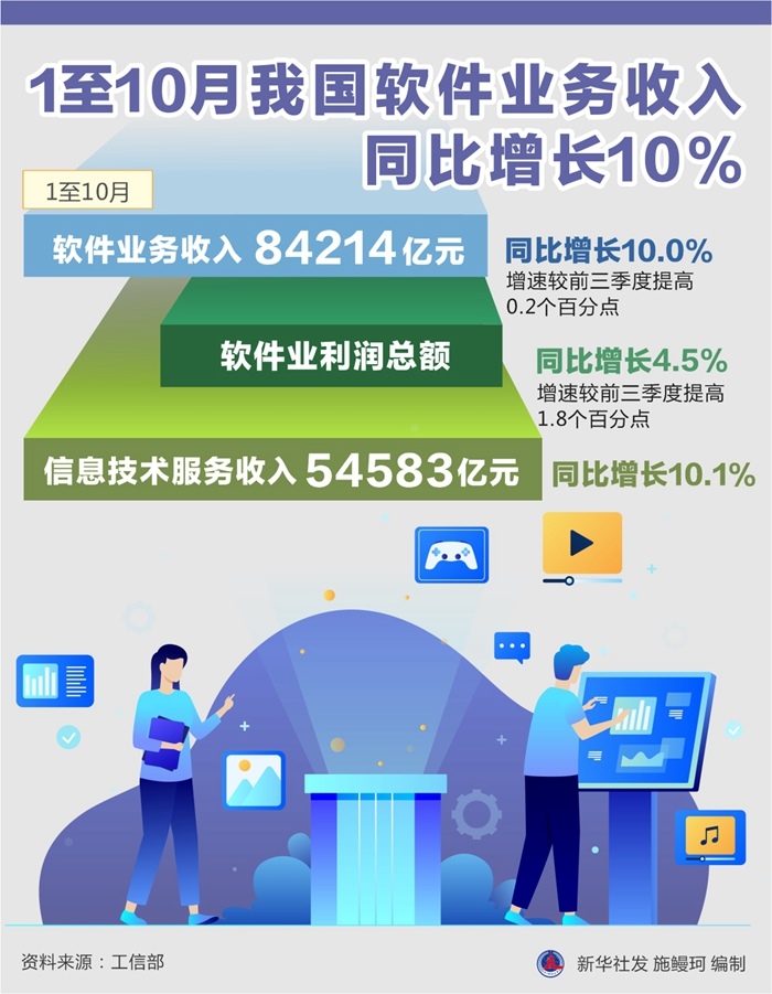 記者24日從工信部獲悉,1至10月,我國(guó)軟件和信息技術(shù)服務(wù)業(yè)運(yùn)行態(tài)勢(shì)平穩(wěn)向好,軟件業(yè)務(wù)收入84214億元,同比增長(zhǎng)10.0%,增速較前三季度提高0.2個(gè)百分點(diǎn)。